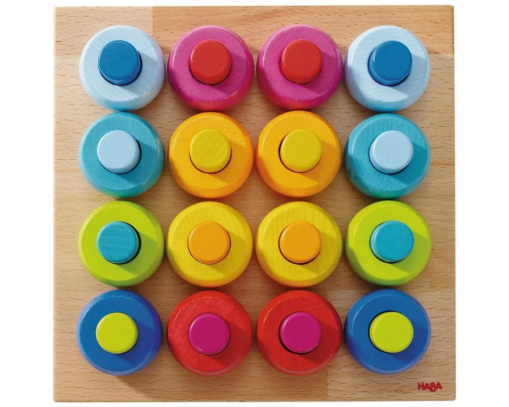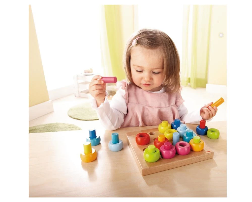 Ein besonderes Erlebnis für kleine Farbenfreunde! Die bunten Stecker und Ringe ermöglichen verschiedene Steckvarianten. Mit Hilfe der Stecker lassen sich die Ringe sogar in die Höhe stapeln. Das Steckspiel eignet sich für das freie Spiel.