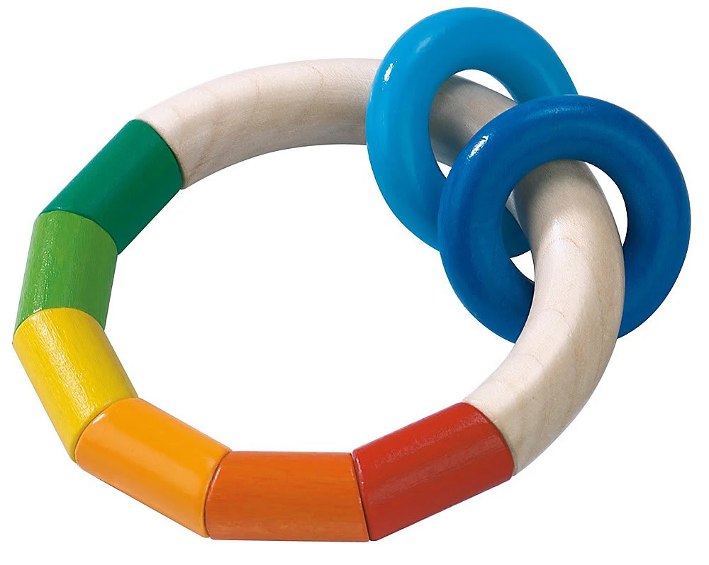 Beiß- und Greifling mit flexiblen, auf Gummi gefädelten Elementen.
