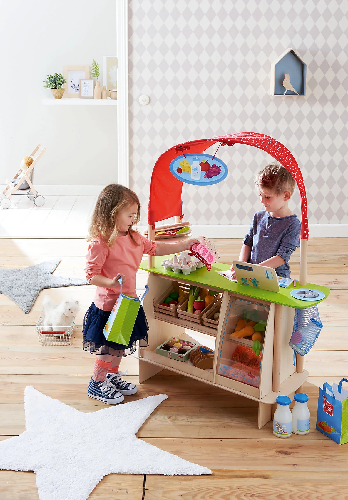 Guten Tag! Was darf´s denn sein? Etwas Süßes oder lieber etwas Herzhaftes? Und wie wäre es mit frischem Obst und knackigem Gemüse? Der HABA-Kaufladen Einkaufsglück mit integrierter Frischetheke hat für seine kleinen Kunden all das zu bieten, denn die Auslagen können ganz nach Lust und Laune mit unterschiedlichsten Kaufladen-Artikeln bestückt werden.