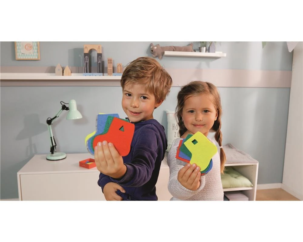 Inhalt: 4 farbige Wäschekörbe, 4 Socken-Sets (je 5 Socken mit gleicher Ausstanzung), 1 Wäscheklammer, 1 Spielanleitung.
