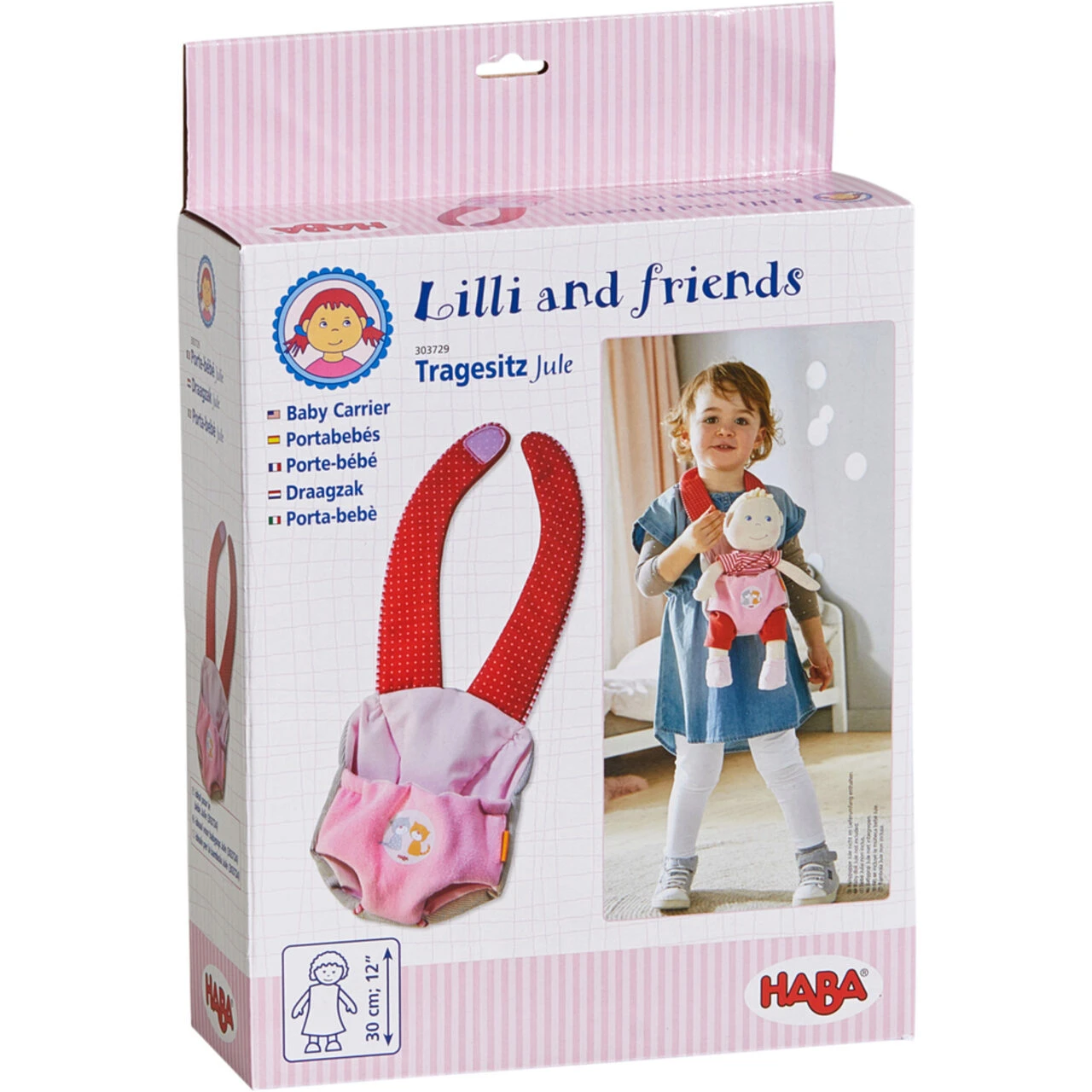 Der HABA-Tragesitz Jule ist eines der vielseitigen Babypuppen-Accessoires der HABA-Reihe Jule. Mit ihnen können sich alle Puppenmamas und -papas liebevoll um die Babypuppe Jule kümmern. Wie ein richtiges Baby, möchte sie von ihren Puppeneltern gekuschelt, getragen und umsorgt werden. Mit dem Tragesitz Jule nehmen echte Puppeneltern ihren kleinen Schützling einfach überallhin mit. Der Klettverschluss sorgt für angenehmes Tragen, einfaches Anlegen und Abnehmen. Dank flexiblem Gummi sitzt die Babypuppe Jule bequem. Auch andere etwa 30 cm große Puppen und Kuscheltiere lassen sich darin einfach transportieren. Mit dem Tragesitz Jule werden Puppen-Rollenspiele für alle Puppenfreunde ab 1,5 Jahren abwechslungsreicher und realitätsnaher.