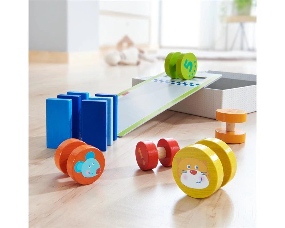 Auf die Plätze, fertig, los! Beim Motorikspiel Rasantes Walzenrennen von HABA kullern runde Walzen eine Rampe hinunter, um am Ende schwungvoll mehrere Dominosteine zu Fall zu bringen. Wer am weitesten kommt, gewinnt. Jede Walze ist aus Holz und hat eine andere Größe sowie Farbe. Auf der einen Seite sind die Zahlen von 1 bis 5 abgebildet, auf der anderen Seite sind niedliche Tiergesichter zu sehen. Das rasante HABA-Motorikspiel bietet Babys ab 18 Monaten eine Menge Abwechslung: Es lässt sich nach einfachen Regeln oder frei, alleine oder zusammen mit Freunden spielen. Ganz nebenbei trainiert das rasante Walzenrennen auch noch die Feinmotorik.