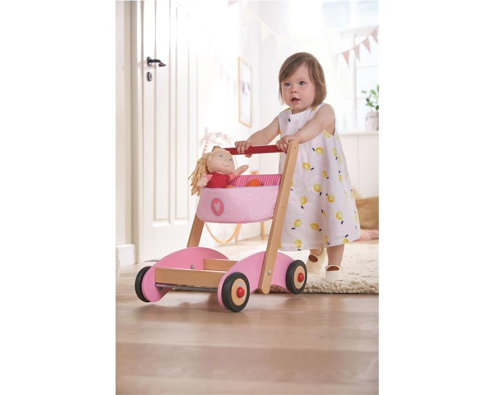 Hochziehen, festhalten und los! Mit dem farbenfrohen Lauflernwagen Glitzer-Flitzer aus Holz in bewährter HABA-Qualität werden die ersten Schritte zum Kinderspiel. Der Wagen unterstützt Kinder ab 10 Monaten beim Erkunden ihrer Welt und gibt Sicherheit bei ersten Gehversuchen. Mit einem großen Transportfach und einer abnehmbaren Tasche am Bügel haben die Kinder ihr Lieblingsspielzeug auf jeder Entdeckungsreise mit dabei. Der Lauflernwagen aus Holz ist leicht zu schieben und gibt dank großer Räder viel Stabilität beim Hochziehen, Festhalten und Losflitzen. Außerdem sorgt die individuell justierbare Bremse dafür, dass die kleinen Entdecker in ihrem ganz eigenen Tempo die ersten Schritte tun können. Das liebevoll gestaltete Design mit Streifenmuster und Herzmotiv bringt die Augen der Kinder zusätzlich zum Strahlen.