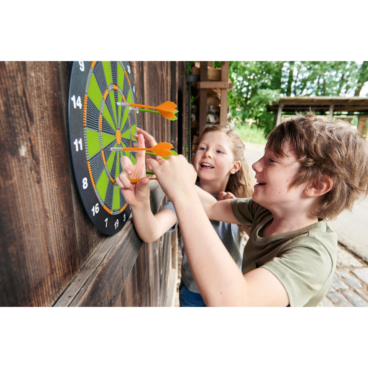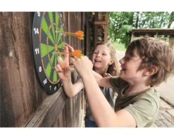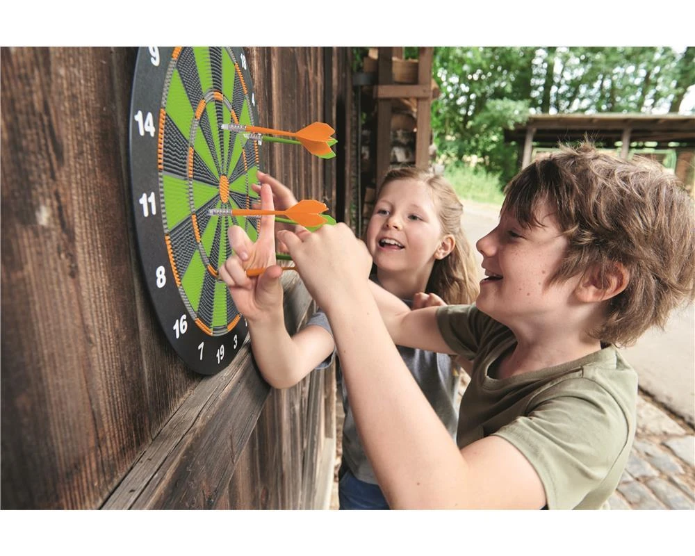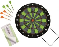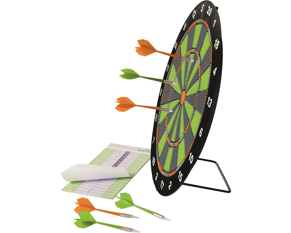 - enthält alles zum Gleich-Losspielen: Dartscheibe, Pfeile und Turnierblock