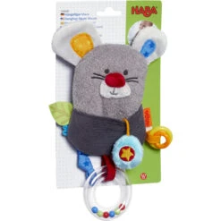 Die fröhliche kleine Maus sorgt zu Hause und unterwegs für viel Abwechslung und gute Laune: das linke Ohr knistert, aus der Bauchtasche kommt ein kleines Quietsch-Element zum Vorschein und wenn der Kunststoffring geschüttelt wird, rasseln die Kügelchen lustig hin und her.