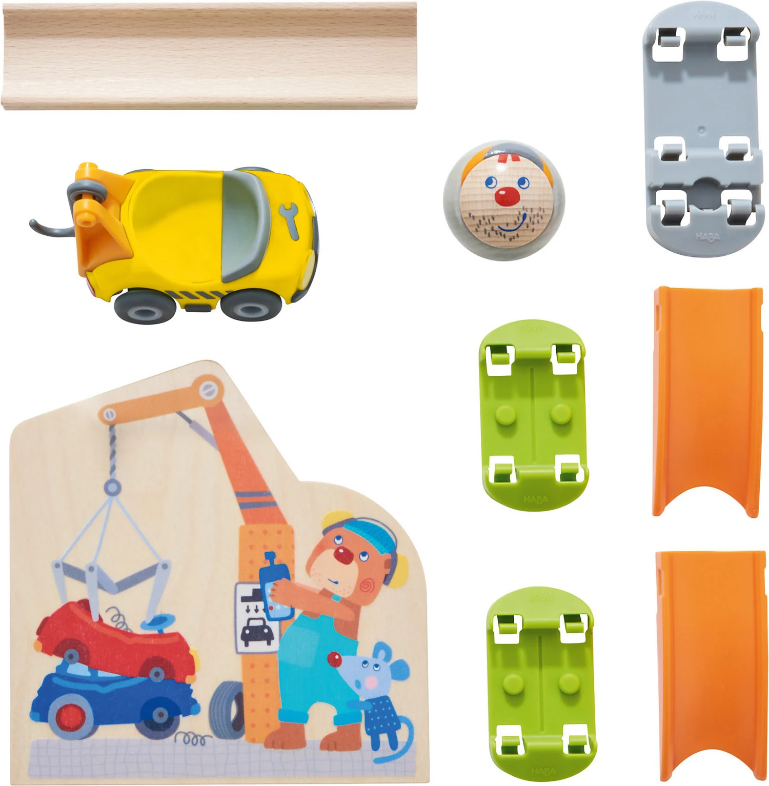 Die Kullerbü-Fahrzeuge sausen immer rasant durch die Bahnen. Doch auch sie haben mal eine Panne oder einen Unfall. Dann geht es zunächst in die Werkstatt … und wenn das nicht mehr hilft, landen manche von ihnen auf dem Schrottplatz. Dorthin werden sie von Abschleppmeister Anton mit seinem Abschleppwagen transportiert. Inhalt: 1 Kulisse Schrottplatz, 1 Abschleppwagen, 1 Kugel Abschleppmeister Anton, 1 Gerade, 2 Abfahrtsrampen, 1 Kulissenklemme, 2 Verbindungselemente. das Themenset Schrottplatz von Kullerbü regt mit der Kulisse Schrottplatz und dem Abschleppwagen zu fantasievollen Geschichten an mit dabei für großes Kullervergnügen: Kugel Abschleppmeister Anton Aufbau und Spiel fördern die Kreativität und Feinmotorik von Kindern ab 2 Jahren auch perfekt zum freien Spiel geeignet kombinierbar mit jeder Kullerbü-Spielbahn