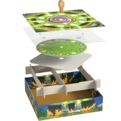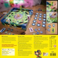 Inhalt: 1 Wunderkessel (bestehend aus: Schachtelboden mit Einleger, Steckkreuz, Zwischenboden, Drehscheibe, transparente Folie mit Symbolen und Spielplan), 1 Drehfigur Wirbelwind, 4 Zauberlehrlinge aus Holz, 4 Spielermarker, 20 Zutaten-Plättchen (Unkenlaich, Krötenpilz, Löwenfischgräte, Hexenwurm, Drachenkristall in jeweils 4 Farben), 36 Zaubertrank-Plättchen, 12 Zaubermünzen, 1 Spielanleitung.