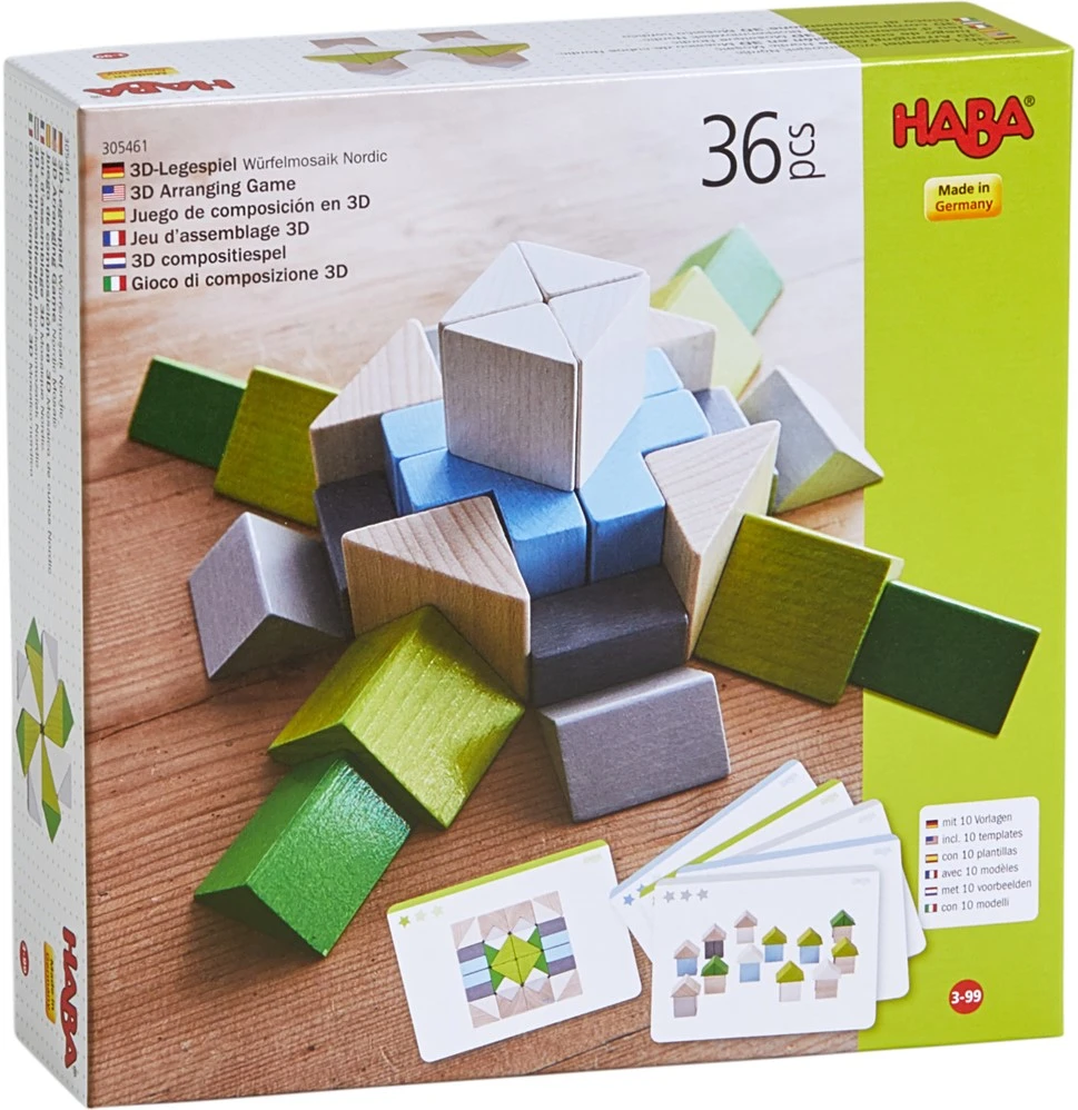 HABA 3D-Legespiel Würfelmosaik Nordic. Kreativ sein mit Formen und Farben – das 3D-Legespiel Würfelmosaik Nordic bietet unzählige Möglichkeiten beim Legen und Stapeln. Die harmonischen Farben begeistern Groß und Klein. Zum freien Spielen oder zum Legen und Bauen nach Vorlage.