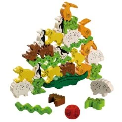 Tier auf Tier ist ein wackeliger Stapelspaß von HABA, der alle begeistern wird. Mutig versucht der kleine Pinguin den Gipfel der Tierpyramide zu erklimmen und startet seinen Aufstieg auf dem Rücken des Krokodils. Tier auf Tier kommen immer mehr dazu, da steht das Schaf auf dem Tukan und der Affe auf dem Igel. Wer schafft es sich auch oben an der Spitze zu halten? Das spannende Stapelspiel Tier auf Tier schult das vorausschauende und dreidimensionale Denken, denn das wird benötigt, um die Tiere geschickt aufeinanderzusetzen. Die großen Tiere aus Holz lassen sich leicht greifen und das Stapeln schult die Feinmotorik. Daneben wird die Auge-Hand-Koordination gefördert. Das aufregende HABA-Spiel sorgt für immer wieder aufs Neue für jede Menge Spielspaß.