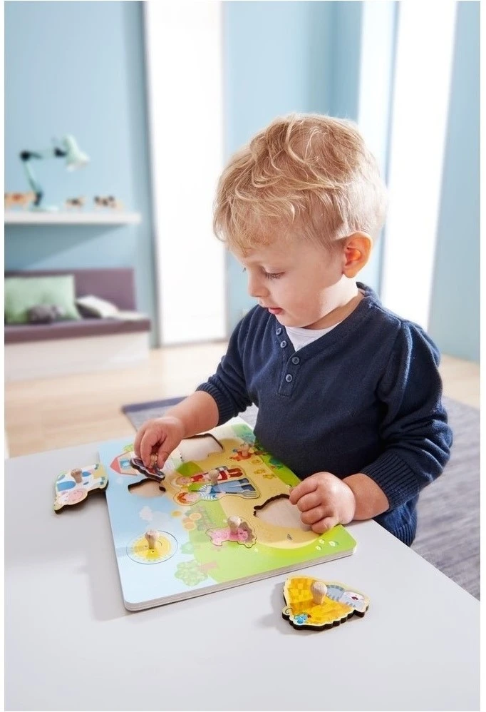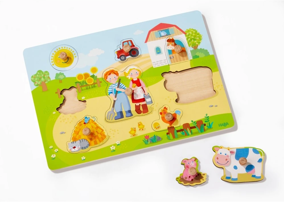 Auf dem Bauernhof gibt es viel zu entdecken: die lustigen Tiere, den Bauern und die Bäuerin, den tollen roten Traktor und über allem strahlt die Sonne. Die Puzzleteile sind dank ihrer großen, griffigen Knöpfe leicht zu greifen.