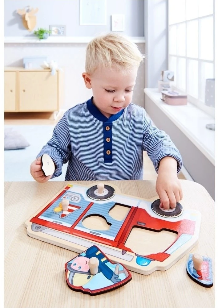 HABA Greifpuzzle Feuerwehrauto. Tatü-tata, die Feuerwehr ist da! Mit dem schönen Greifpuzzle können Kinder das Feuerwehrauto Stück für Stück entdecken. Feuerlöscher, Schläuche, Warnsignale: Alles hat seinen Platz! Die Puzzleteile lassen sich von Kinderhänden besonders gut greifen. So macht Puzzeln alleine oder gemeinsam viel Spaß!