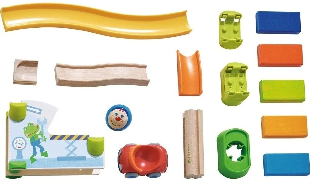 „Ab ins Auto“ heißt es bei dem gleichnamigen Kullerbü-Themenset von HABA, das Kinder mit einem tollen Spieleffekt begeistert: Die Kugel Bert Boller kann hier schwungvoll über eine Rampe ins Kugel-Cabrio einsteigen und über eine Sprungschanze hinabsausen, um am Ende mit Karacho mehrere Dominosteine umzuwerfen. Das rasante Kullervergnügen funktioniert auch ohne Fahrzeug, also nur mit der Kugel und dem Spieleffekt als Sprungschanze. Verbinder und Basen sorgen dabei für maximale Stabilität am Boden, während eine Säule Höhe und damit Tempo ins Spiel bringt. Das Themenset Ab ins Auto lässt sich mit jeder beliebigen Kullerbü-Spielbahn zu einer noch größeren Kullerlandschaft erweitern.