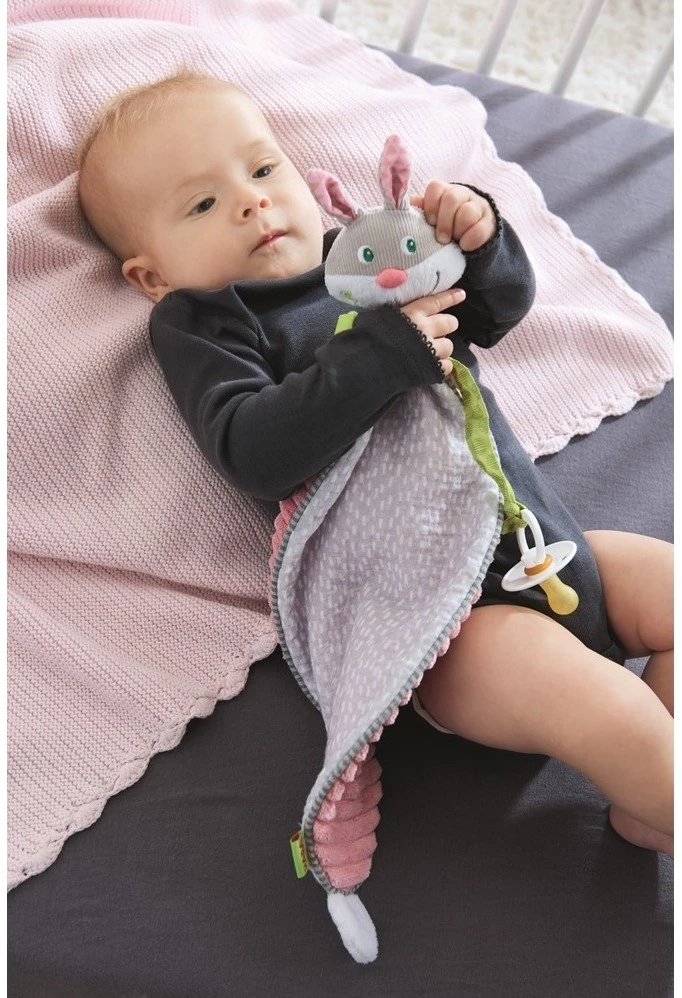 Hoppel, Hops! Dieses niedliche Langohr ist zugleich Spielgefährte und Kuscheltuch! Ist es zusammengerollt, wird aus dem Schmusetuch schnell eine süße Spielfigur mit spannenden Elementen zum Fühlen, Hören und Entdecken.