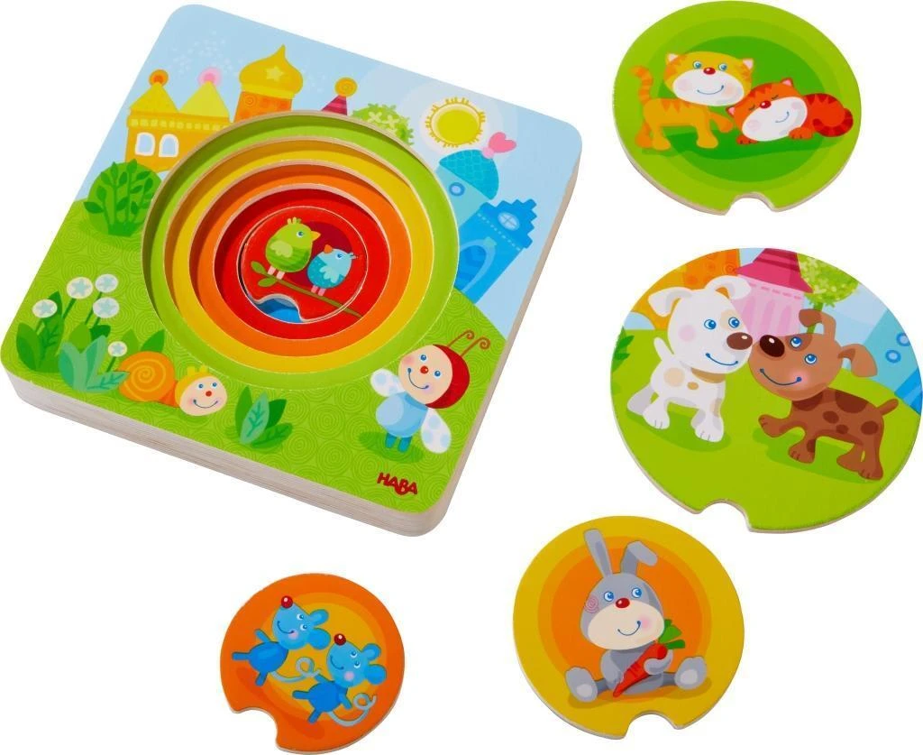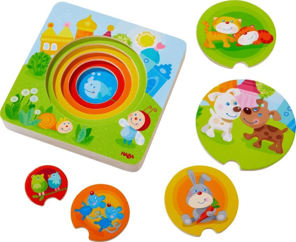 Die niedlichen Tierkinder treffen sich auf der Wiese vor dem Schloss zum Spielen. Wer mag ihnen dabei zusehen? Die einzelnen Puzzleteile werden übereinander in die Aussparungen gepuzzelt. Das macht Spaß und schult die Feinmotorik. Material: Sperrholz. Maße: 15 x 15 cm. 1 Puzzlebrett, 5 Puzzlescheiben.